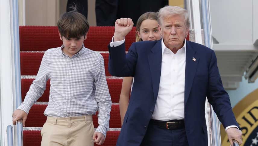President Donald Trump, front right, gestures as he walks down the stairs of Air Force One with his grandchildren, Spencer, left, and Chloe, back center, upon his arrival at Joint Base Andrews, Md., Tuesday, July 29, 2025.